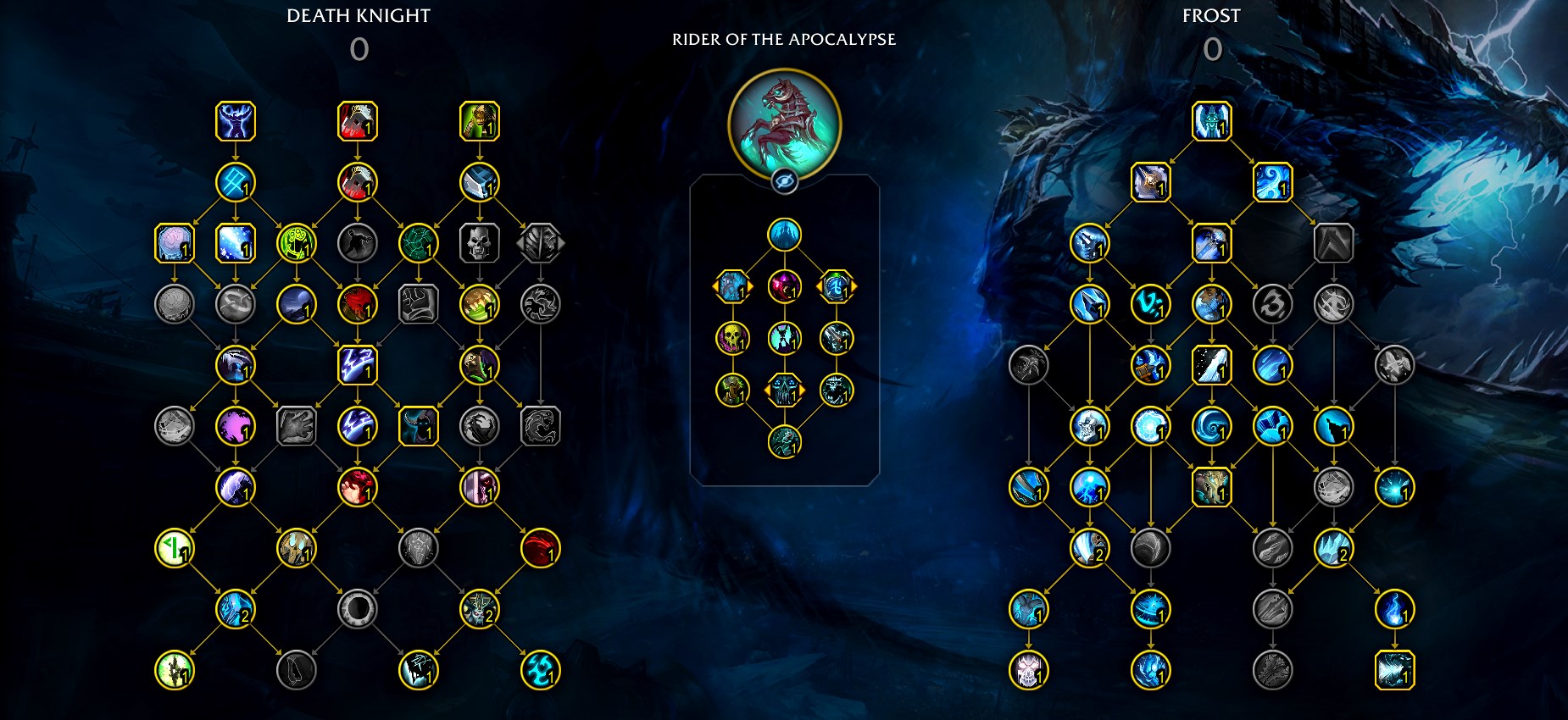Il n’y a quasiment pas de changement de gameplay avec cet arbre de talents héroïque. La seule différence est la présence obligatoire de Souffle du wyrm de givre dans notre arbre de talent, puisque ce sort invoque les 4 cavaliers d’un coup. Cela permet tout de même d’avoir des fenêtres de burst 1min30 prévisibles et efficaces.